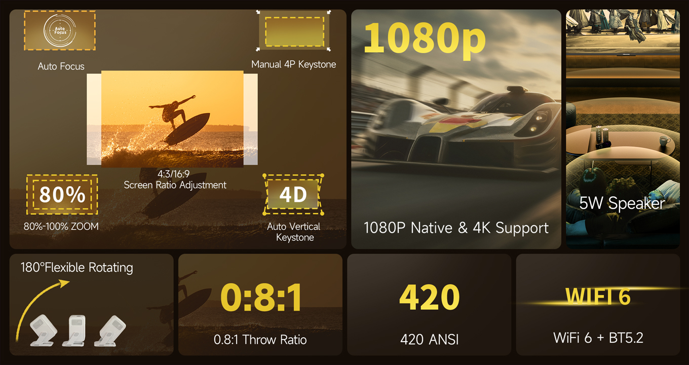 Connectivity and audio are enhanced with Bluetooth 5.2 and built-in 5W Hi-Fi stereo speakers. Users can pair it with other Bluetooth devices or enjoy immersive sound directly from the projector. It also supports 80%–100% manual zoom, 4:3 and 16:9 aspect ratios, customizable brightness and contrast, and a sleep timer for a more personalized viewing experience.